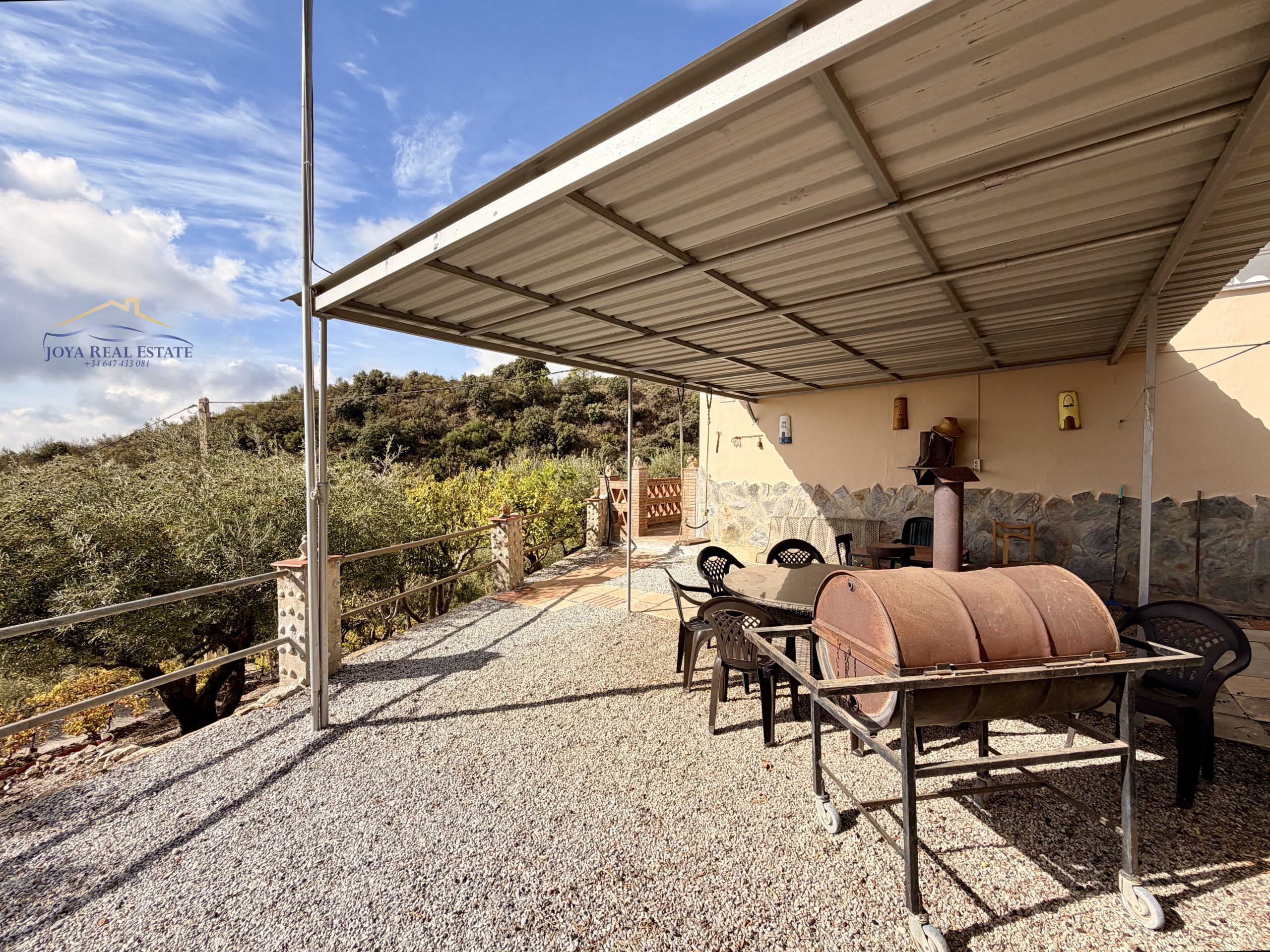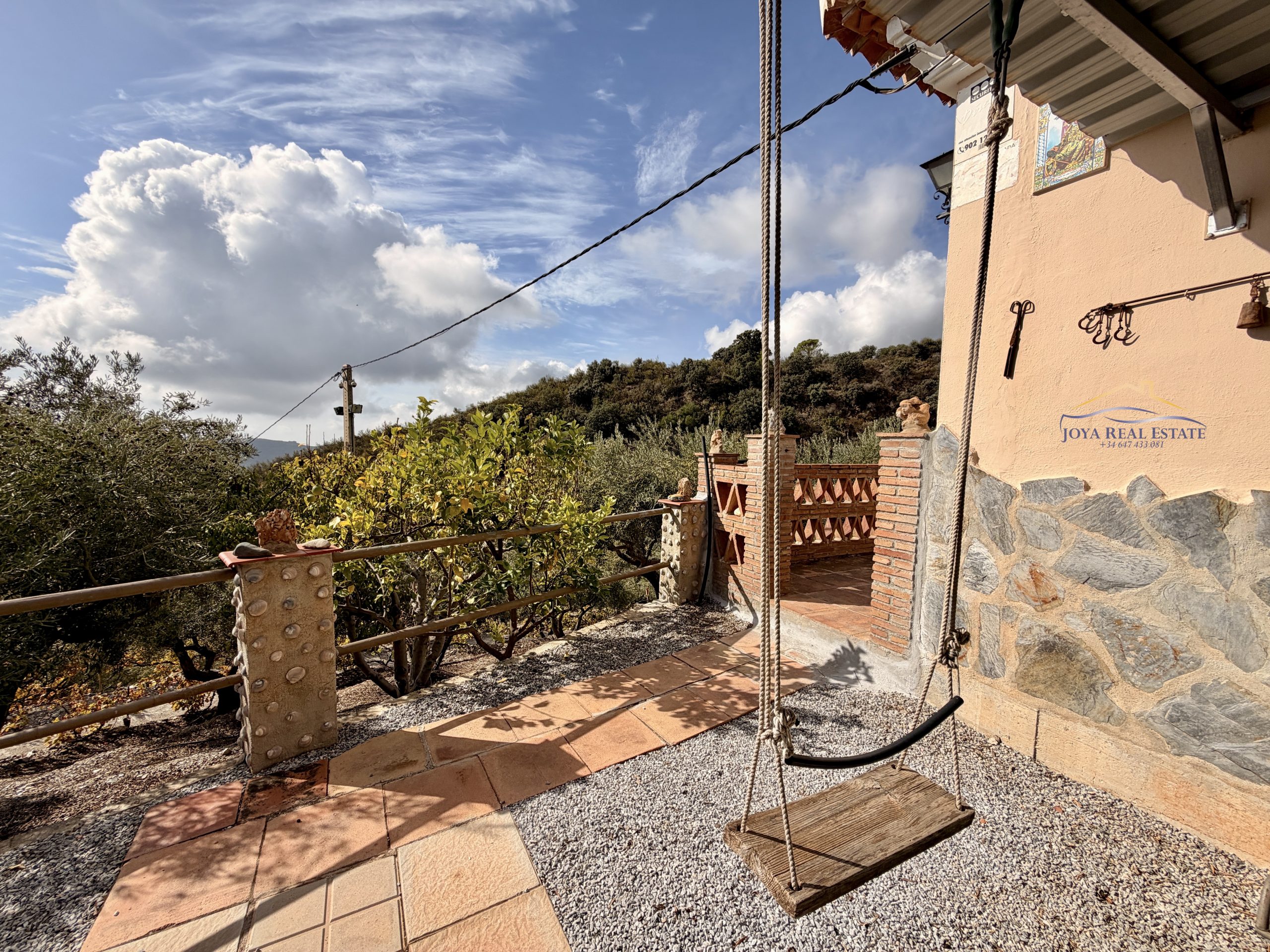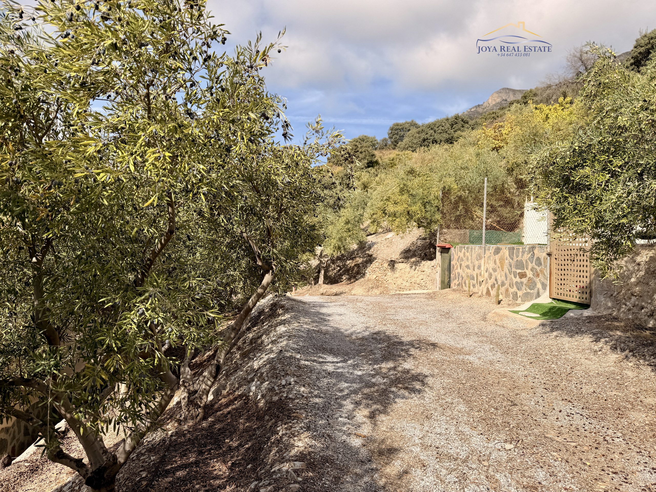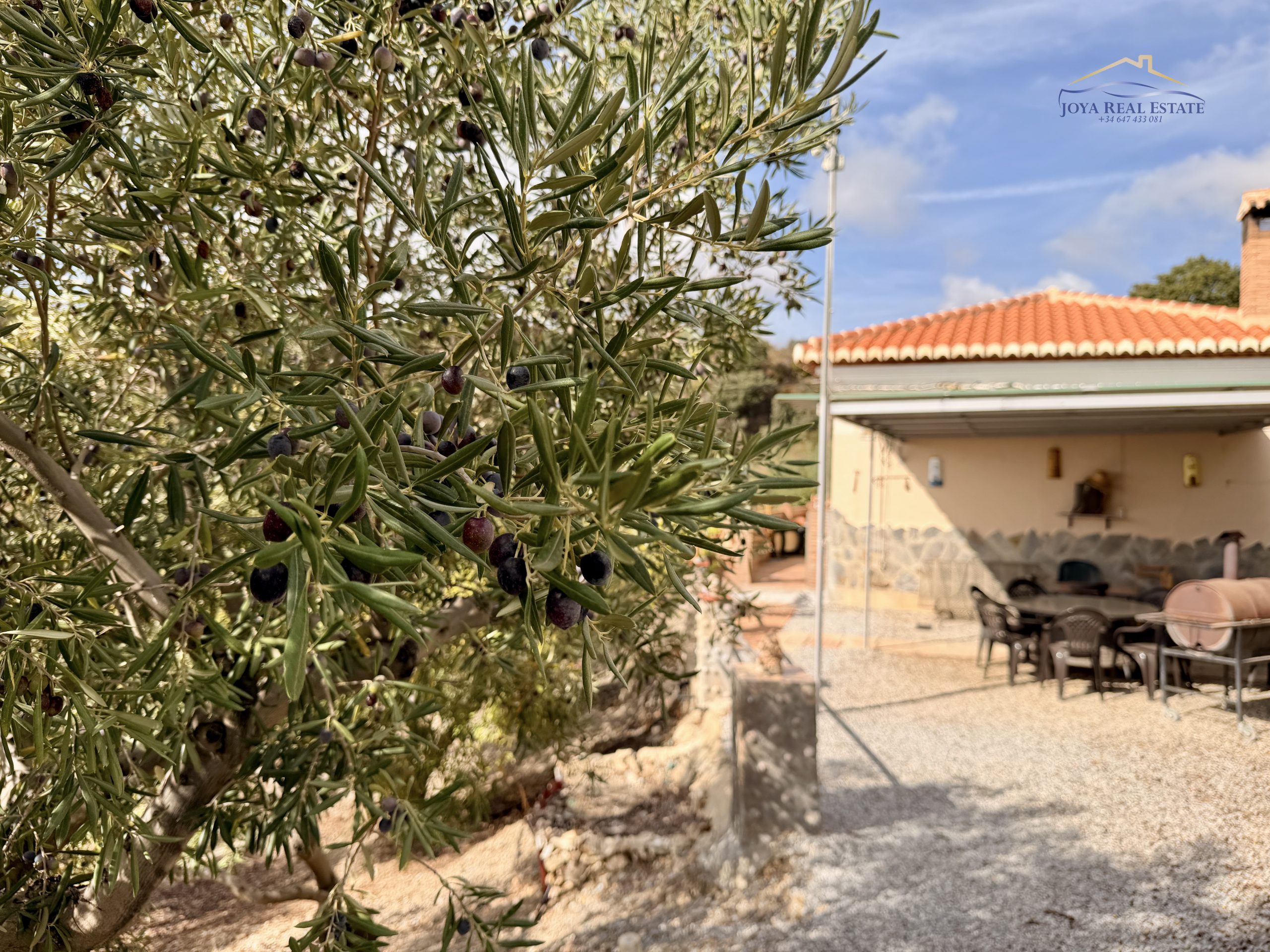 La propiedad ocupa un terreno totalmente vallado con acceso privado mediante portón automático, aparcamiento cubierto, videovigilancia y un almacén de aperos. Su tierra fértil y libre de productos químicos alberga una gran variedad de árboles frutales: manzanos, higueras, guayabos, nísperos, melocotoneros, parras, naranjos y olivos. Estos últimos permiten elaborar tu propio aceite ecológico con etiqueta personalizada, una experiencia única y auténtica.